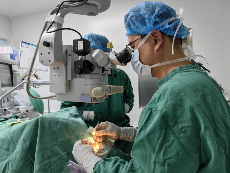由于刘大爷同时患有老年性白内障,手术需分两步实施:先通过角膜移植恢复透明角膜,再二期行白内障手术。5月16日,南昌爱尔眼科医院在全国爱尔眼库系统调配角膜供体;5月22日,角膜调配到位,次日,黄海主刀为刘大爷实施左眼穿透性角膜移植术。术中,完整移除混浊角膜,并将供体角膜精准缝合于受置。术后第一天复查,刘大爷角膜恢复透明,上皮恢复良好,一周后复查显示,视力从术前手动计数恢复至0.2。黄海表示,目前角膜植片运行稳定,待术后一个月炎症消退,刘大爷还可进行白内障手术,视力可进一步提升。